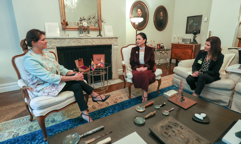 La esposa del Mandatario ecuatoriano se reunió con María Juliana Ruiz, esposa del Presidente de Colombia, a quien ofreció apoyo durante su gobierno para el desarrollo de políticas enfocadas en la atención a grupos prioritarios, a través de la Misión “Las Manuelas”; así como a la primera infancia, mediante el programa emblemático Misión Ternura.