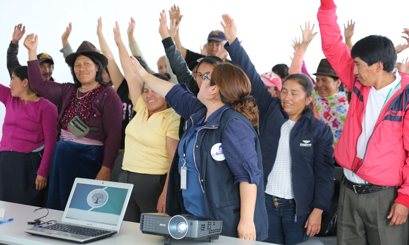 Quito (Pichincha).- Los primeros beneficiarios del proyecto habitacional San Francisco de Huarcay y los gestores sociales de la Secretaría Técnica Plan Toda una Vida (STPTV) participaron este viernes 20 de abril en un taller de la Estrategia de Fortalecimiento Comunitario, en el marco del programa Casa para Todos.