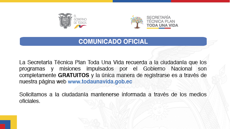 Por ello, hacemos un llamado a la ciudadanía en general a remitirse siempre a fuentes de organismos oficiales y recordamos que todo tipo de trámite relacionado con el acceso a alguno de los programas o misiones que forman parte del Plan Toda una Vida son completamente gratuitos.